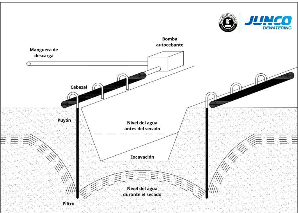 Este sistema consiste en instalar una serie de puyones alrededor del área afectada, los cuales están conectados a una bomba autocebante que extrae el agua del suelo a través de mangueras de succión. Al bombear el agua, el sistema ayuda a reducir el nivel freático, desaguando el área de trabajo y permitiendo que los trabajos se realicen en condiciones más secas y seguras.