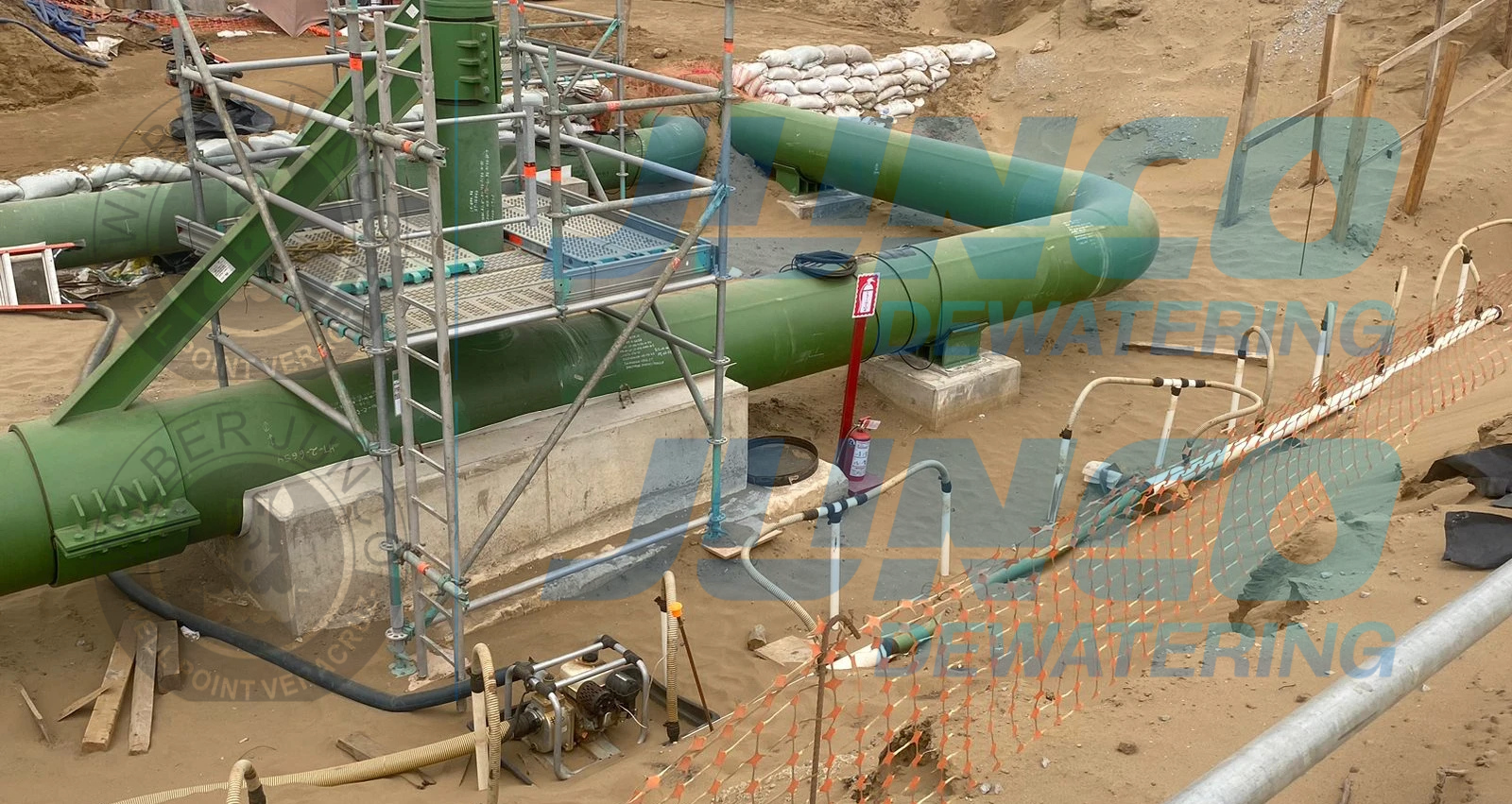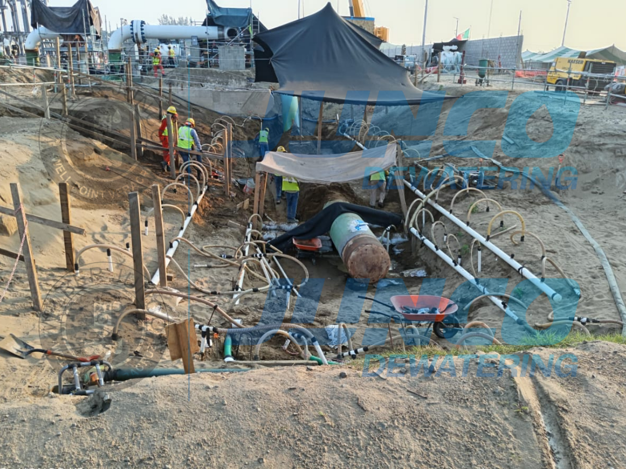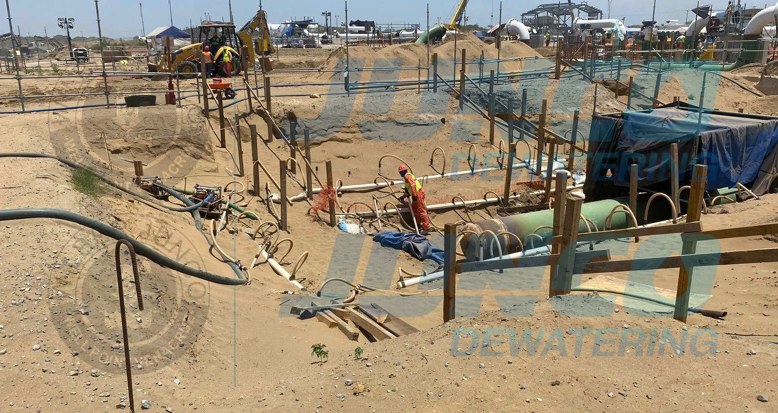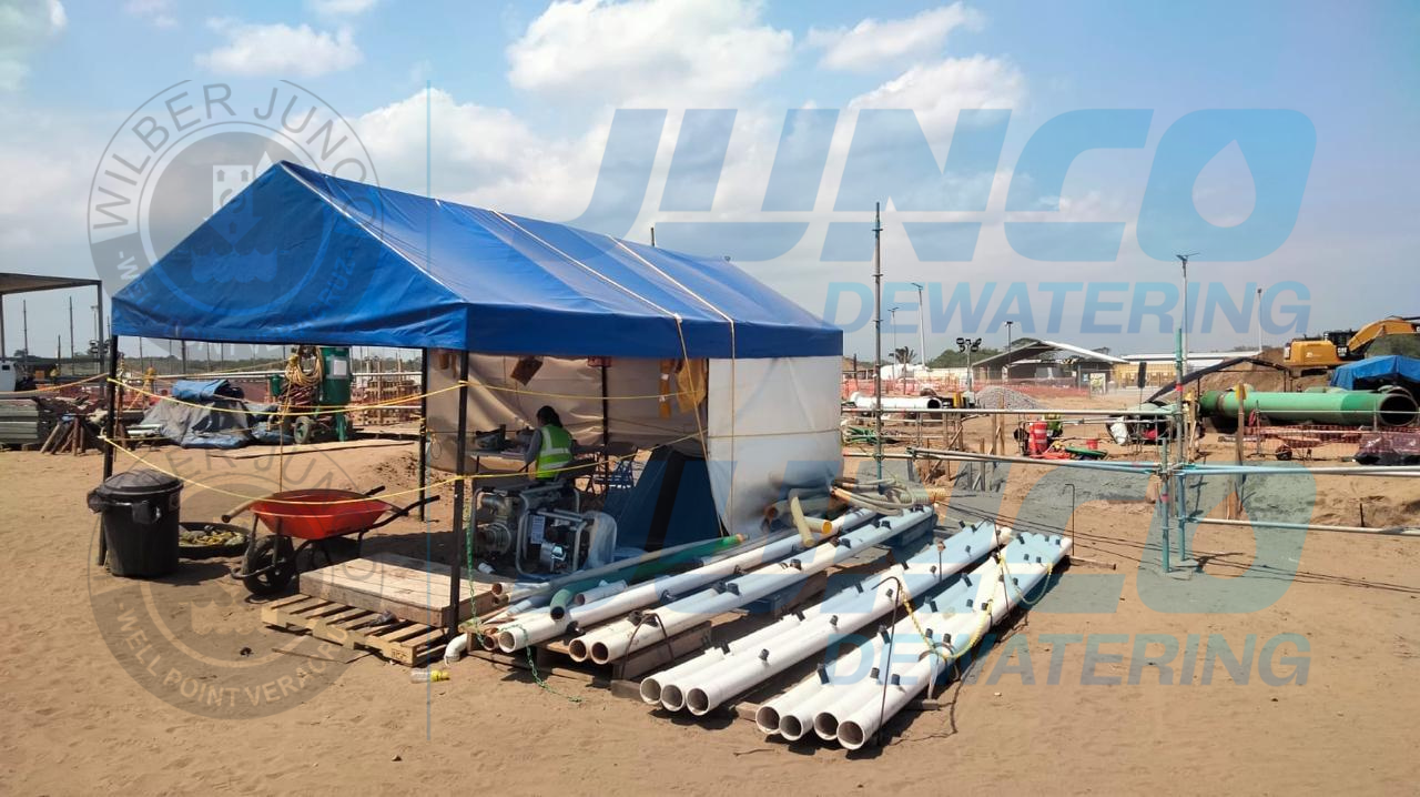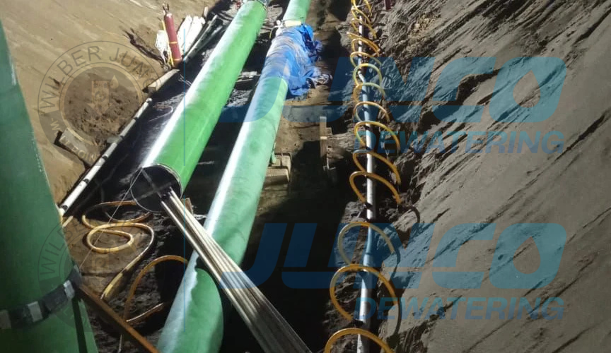 Nuestra participación en este proyecto consistió en el abatimiento de N.A.F. mediante bombeo sistema Well Point durante los trabajos de excavación, instalación, pruebas hidrostáticas y pruebas de radiación para la comprobación de integridad en uniones de tubería de 36″ en la estación de compresión parte del proyecto Puerta al Sureste de TC Energía y CFE.